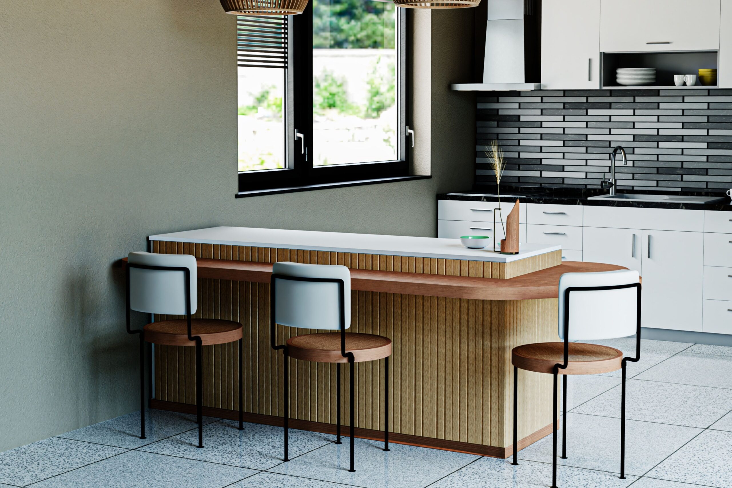 • Ada veya Yarımada: Mutfak tezgahını uzatan bir mutfak adası veya yarımada, mutfak fonksiyonunu oturma/yemek alanından ayırırken, aynı zamanda ekstra bir çalışma yüzeyi veya bar alanı sunar.